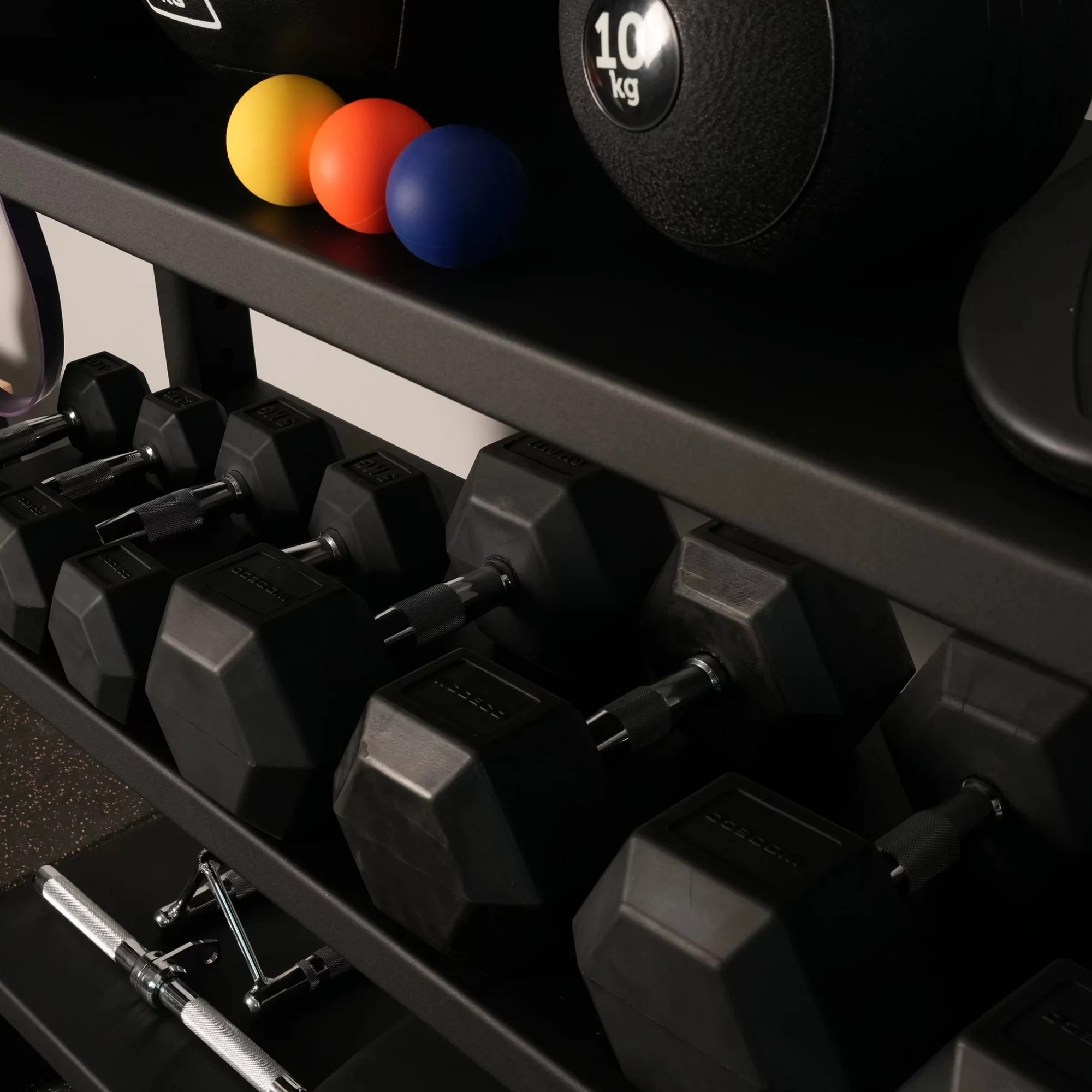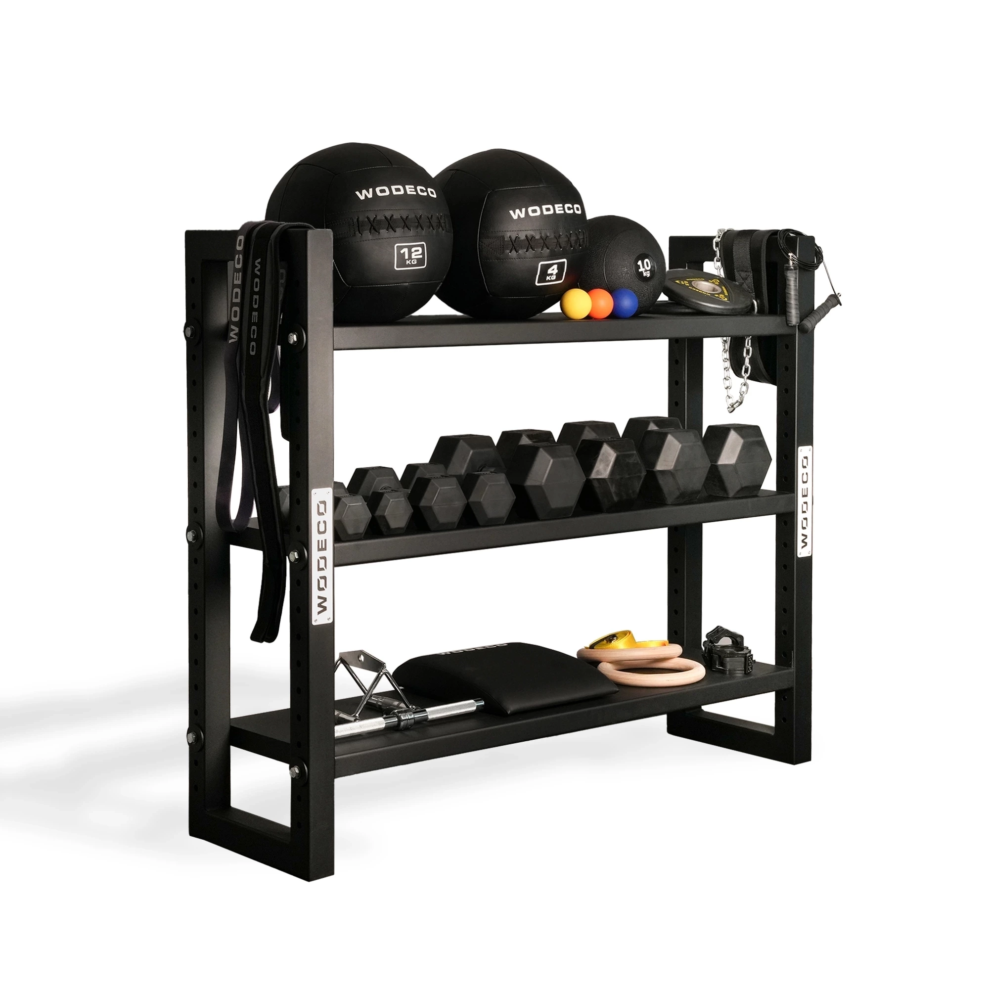 Depolama raflarınızın katlarını ihtiyacınıza göre kullanabilirsiniz. Her üç katı Kettlebell, Wall Ball veya Dumbbell rafı olarak kullanabileceğiniz gibi, katlar farklı ürünlerin depolanması için de kullanılabilir.